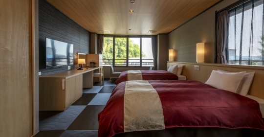 ※半露天風呂は洋モダン・エグゼクティブのお部屋すべてにございます。※ご宿泊人数によりお部屋をご案内させていただいておりますので、特定の半露天風呂付客室をご指定いただくことはできかねます。