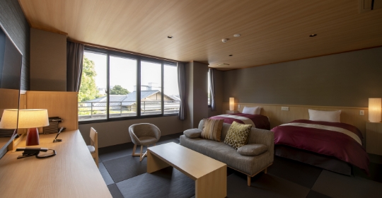 奥行きのある広々空間に、幅広ベッド、ゆったりソファの他、デスク、チェア、テーブルが配された「和モダン スーペリア」。独立した部屋構造で、より静かにお過ごしいただける上質な空間となっております。デザイン畳採用で、足元から心地よい時間をお届けいたします。