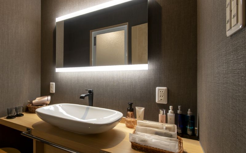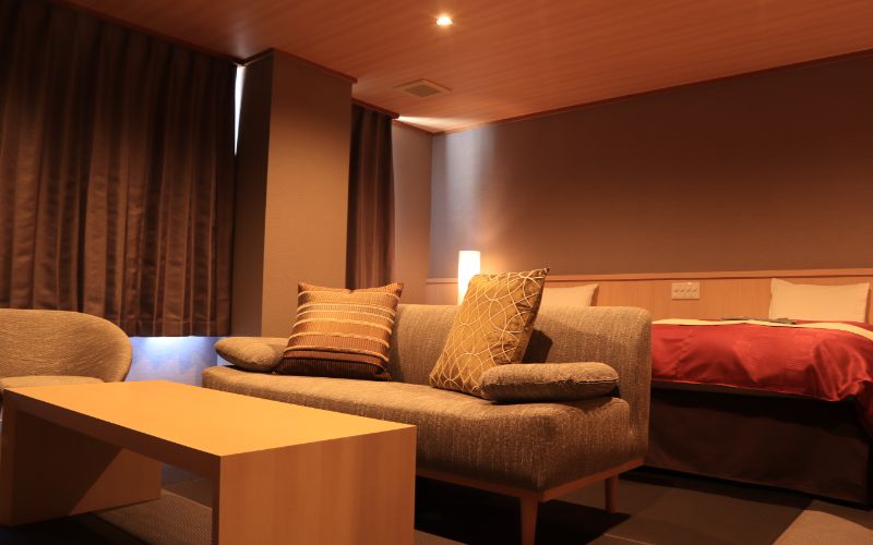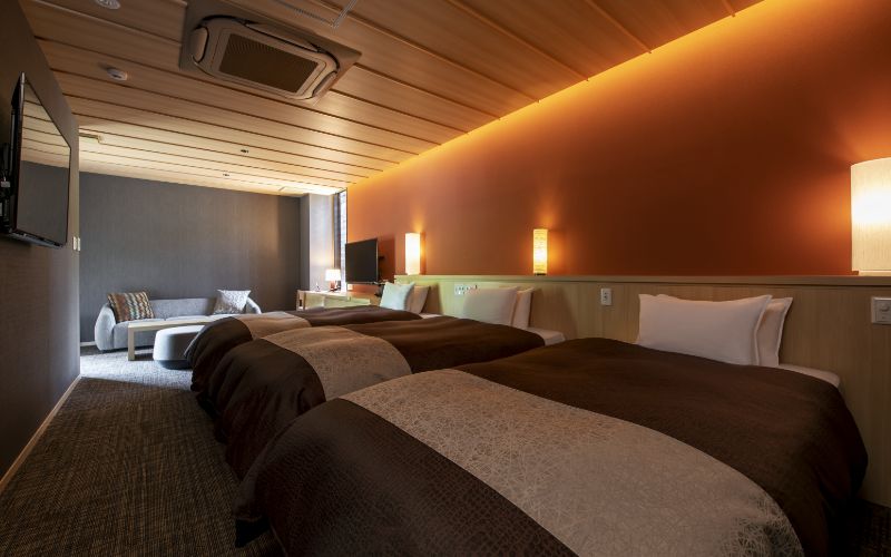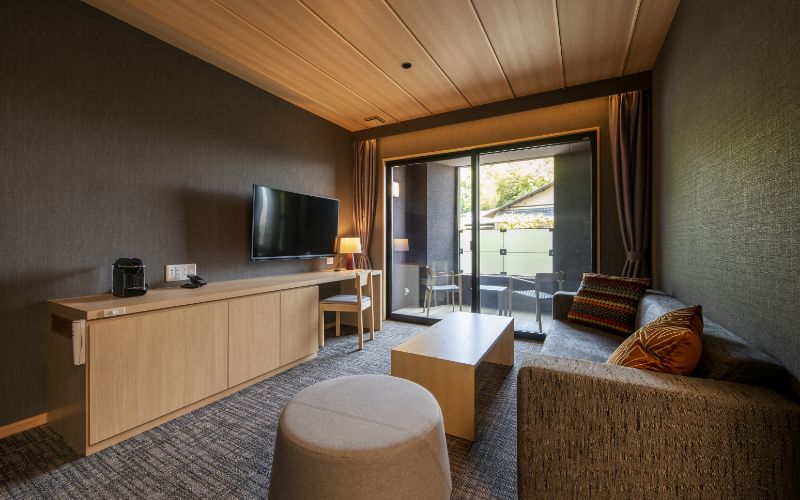 ウッドを基調とした客室は、モダンな落ち着いた雰囲気でゆったりとお過ごしいただけます。その他、広々ソファやデスク、チェア、テーブルがあり、ゆったりとおくつろぎいただけます。